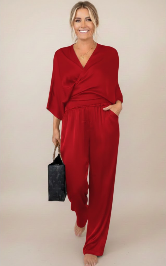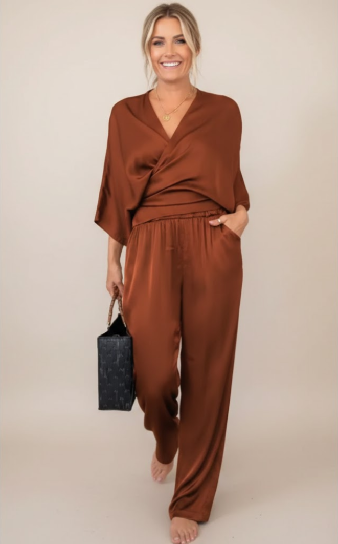 Grâce à son décolleté en V enveloppant, cet ensemble met subtilement en valeur le buste tout en restant agréable à porter. Sa coupe fluide et décontractée épouse naturellement les formes, permettant une grande liberté de mouvement, idéale pour le quotidien.