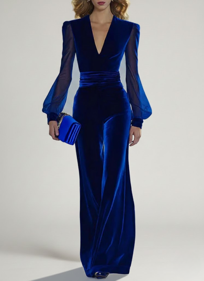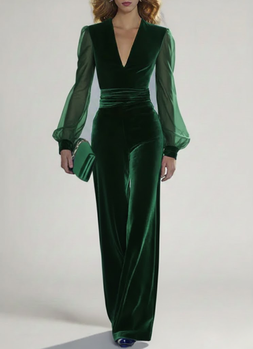 Cette combinaison pantalon raffinée dégage une élégance naturelle et une allure pleine de classe. Elle se distingue par un décolleté en V profond qui allonge visuellement la silhouette et apporte une touche féminine tout en restant sophistiquée. Les manches longues légèrement évasées offrent un tombé gracieux et procurent un confort appréciable ainsi qu’une belle liberté de mouvement.